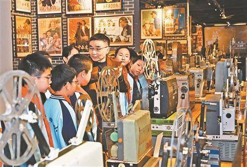 张赛祥上前来研学的学生先容电影放映机的使命旨趣。