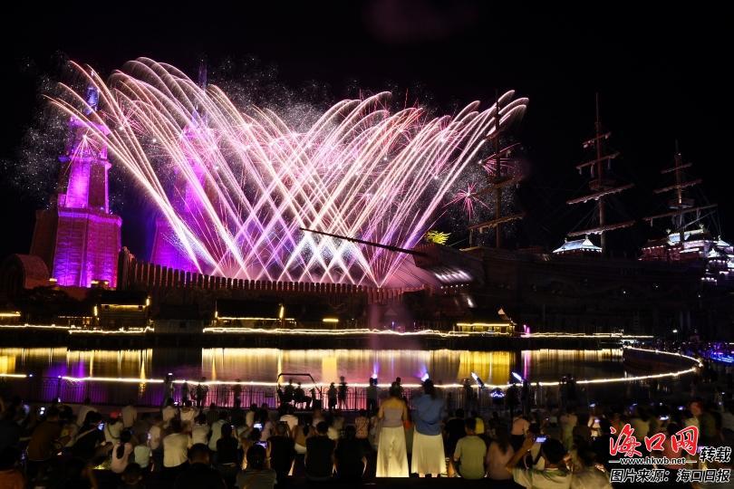 国庆中秋假期,海南长影玄幻乐土秀丽多彩的烟花秀招引繁密旅客前来不雅赏。记者 石中华 摄
