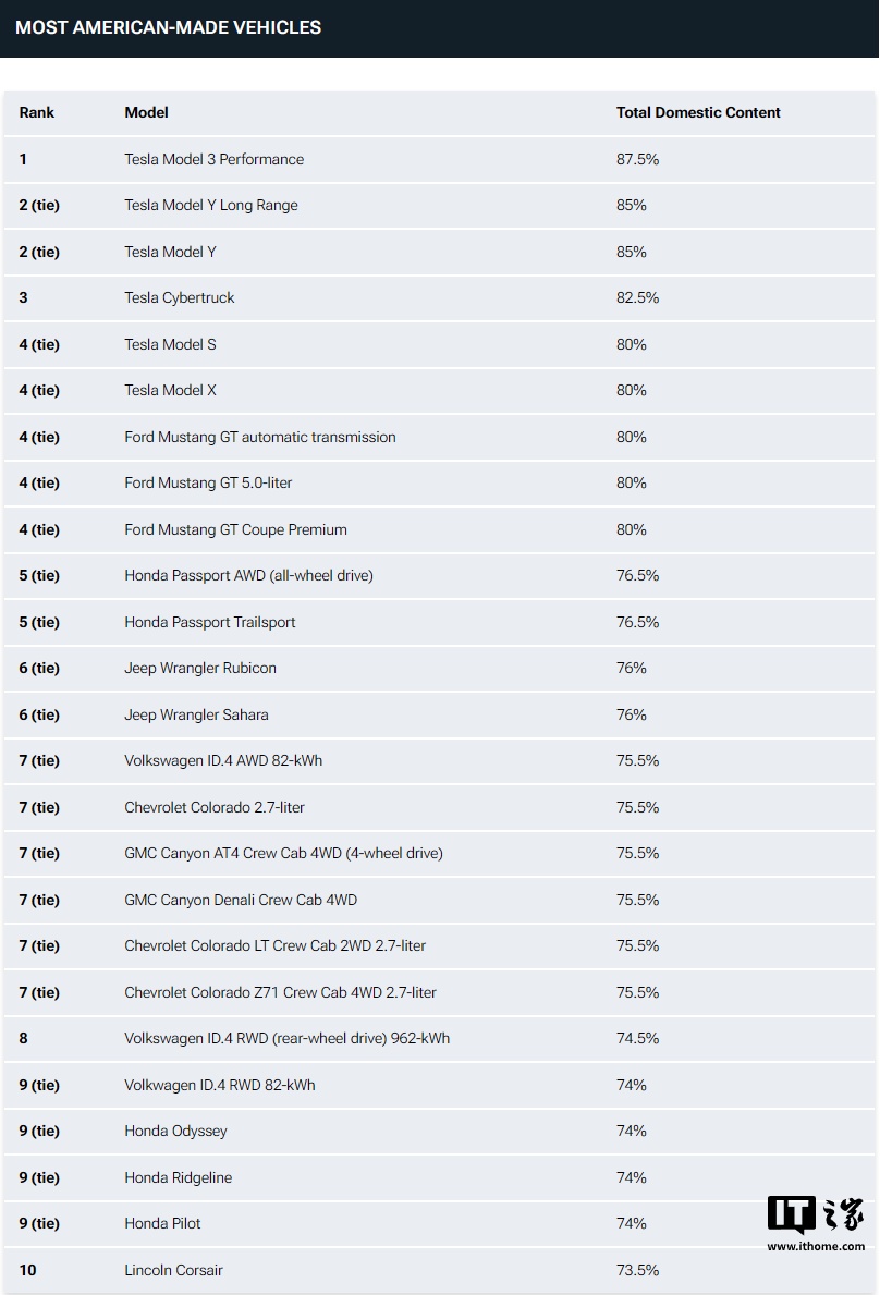 传统车企方面,福特 Mustang GT 和 GT Premium 以 80% 的原土零部件占比与特斯拉 Model S 和 Model X 并排。而本田 Passport AWD 和 Passport Trailsport 分别以 76.5% 的占比排行第五。标榜爱国见解的 Jeep Wrangler Rubicon 和 Sahara 则紧随自后,为 76%。寰宇 ID.4 AWD、GMC Canyon AT4 Crew Cab 及三款雪佛兰科罗拉多车型也以 75.5% 参加榜单。