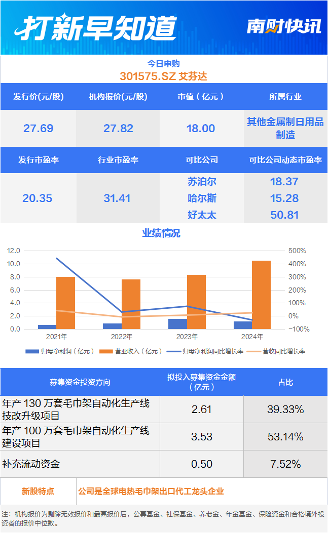 9月1日,可申购创业板的艾芬达(301575)(301575.SZ)。该公司是从事暖通家居居品和暖通零配件的研产销开云体育,主要居品包括卫浴毛巾架系列居品和温控阀、暖通阀门、磁性过滤器等暖通零配件。