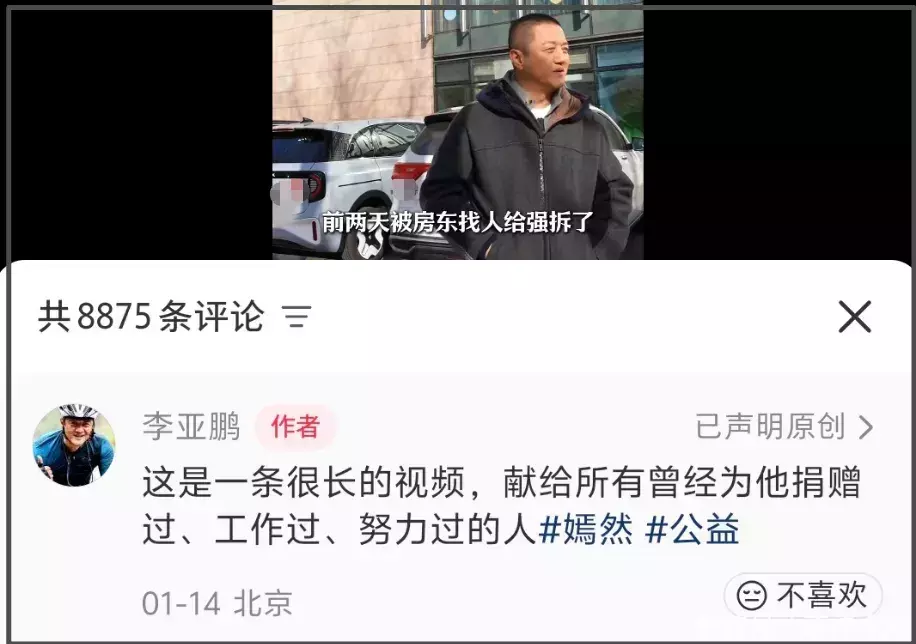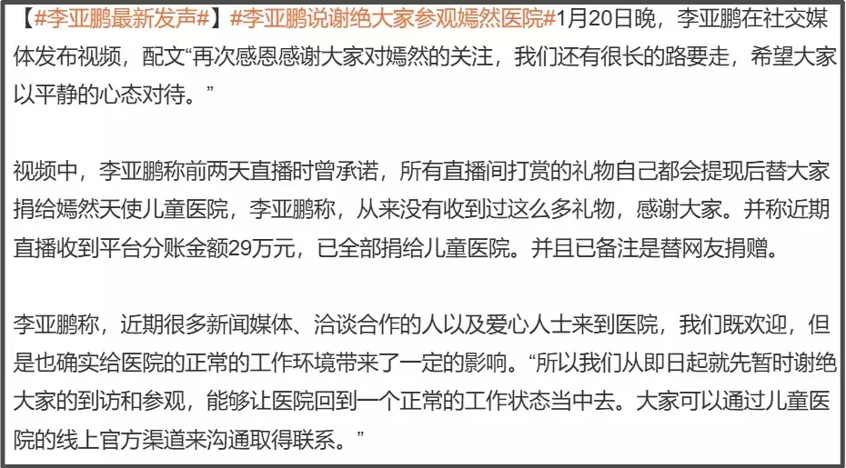 从1月14号李亚鹏发布长视频复兴嫣然病院欠租风云,到李亚鹏遮拦内行参不雅嫣然病院,8天手艺夙昔,整件事果决往好的标的发展了。