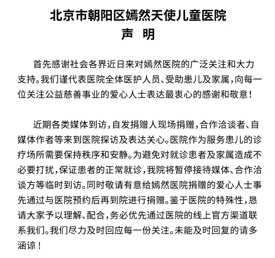 无奈之下,嫣然病院只可发布声明,强调病院行为办事患儿的诊治方式,需要保握递次和忻悦,为了幸免对就诊患者及家属形成无须要惊扰,保证患者的往常就诊,嫣然病院将暂停招待媒体、相助洽谈方等临时到访。