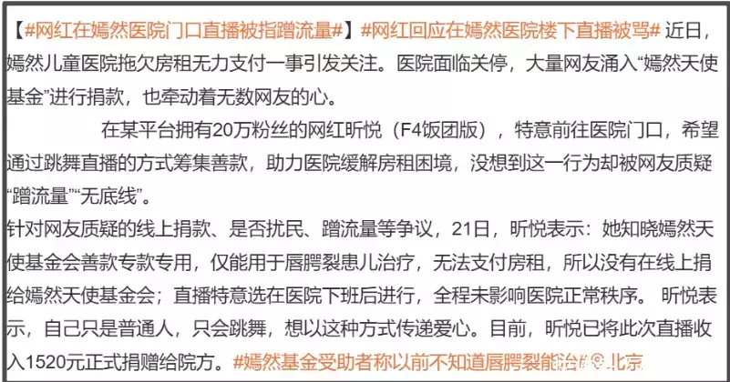 好心办赖事了!最近有网红在嫣然病院门口舞蹈激勉争议,被质疑蹭流量,网红本东说念主复兴我方选不才班手艺赶赴病院,莫得影响递次,她也把直播收入一王人捐馈赠了嫣然病院,但愿捐钱能用于支付房租。