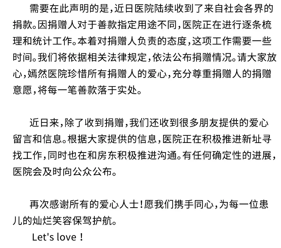 嫣然病院声明也提到,他们收到了来自社会各界的捐赠,会照章公布捐赠情况,同期还收到了许多一又友提供的爱心留言和信息,正在积极鼓舞新居寻找使命,和房主还在积极鼓舞疏浚,一朝有笃定阐述,会实时向外界公布。