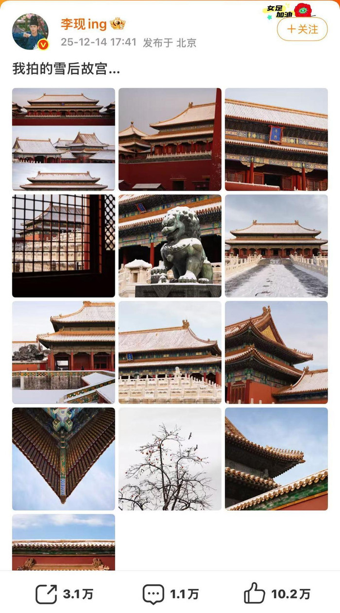 12月14日17时41分许,演员李当今个东说念主微博发布了13张故宫雪景图,并配文“我拍的雪后故宫……”。随后,记者发现,庞杂网友在驳倒区留言“终于比及了”,也有东说念主暗示惊诧,“李现真实拍到了莫得娘娘公主的故宫雪景。”