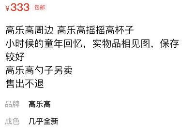它也在二手市场上受到接待。正如著作开始所说的那样,十多年前的高乐高空瓶子会按照磨损进度的不同标价,品相不好的空瓶能买到一两百元,保存更好一些的,能挂到三五百块。而另一些更襄助的限度版,则会以更高的价钱出目前市场上,似乎只消加上一个“老”字,商品的价钱就能成倍增长。