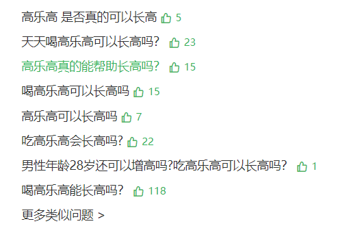 其驱散等于,不少东说念主在回忆起高乐高的时候,它很少会被认定为是“饮料”,更像是一种保健饮品,更有甚者还将其动作长高秘方。即使你目前翻开一些搜索软件输入高乐高,仍然能看到一长串对于“高乐高是不是确实能长高”的发问,足以解说告白力量的普遍。