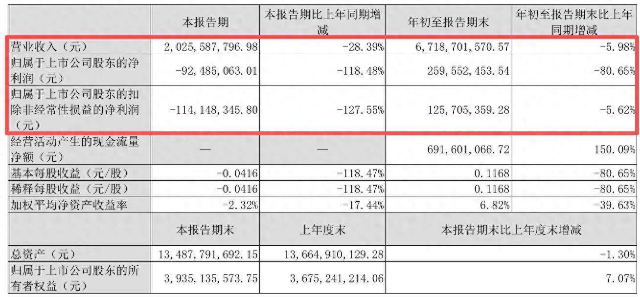 第三季度,公司买卖收入为20.26亿元,同比下降28.39%;归母净利润耗损9248.51万元,同比下降118.48%;扣非归母净利润耗损1.14亿元,同比下降127.55%。