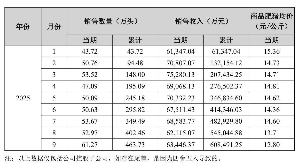 2025年9月份销售商品猪61.27万头(其中仔猪销售25.23万头),销售收入6.34亿元,销售均价13.69元/公斤(商品肥猪均价为12.80元/公斤),环比变动分裂为15.68%、2.14%、-8.88%。